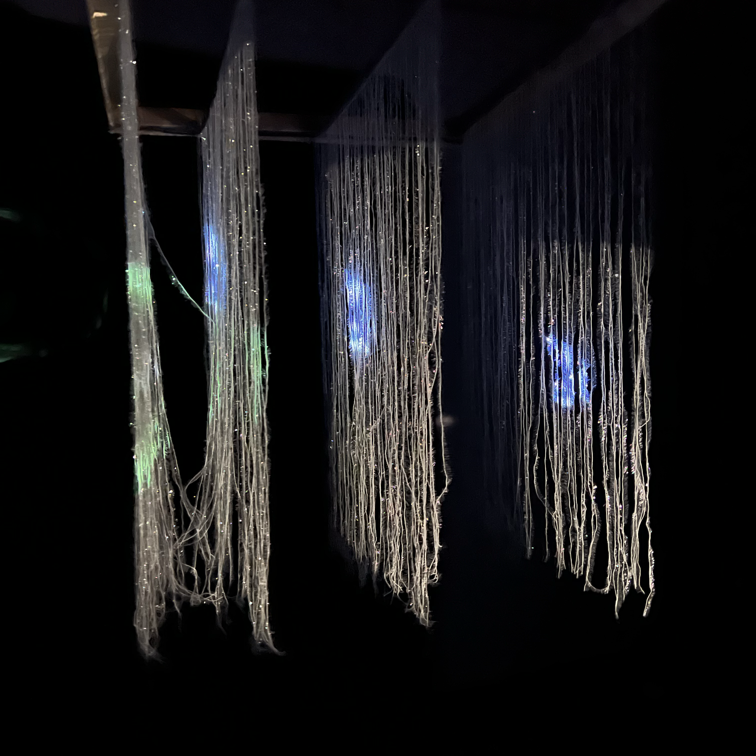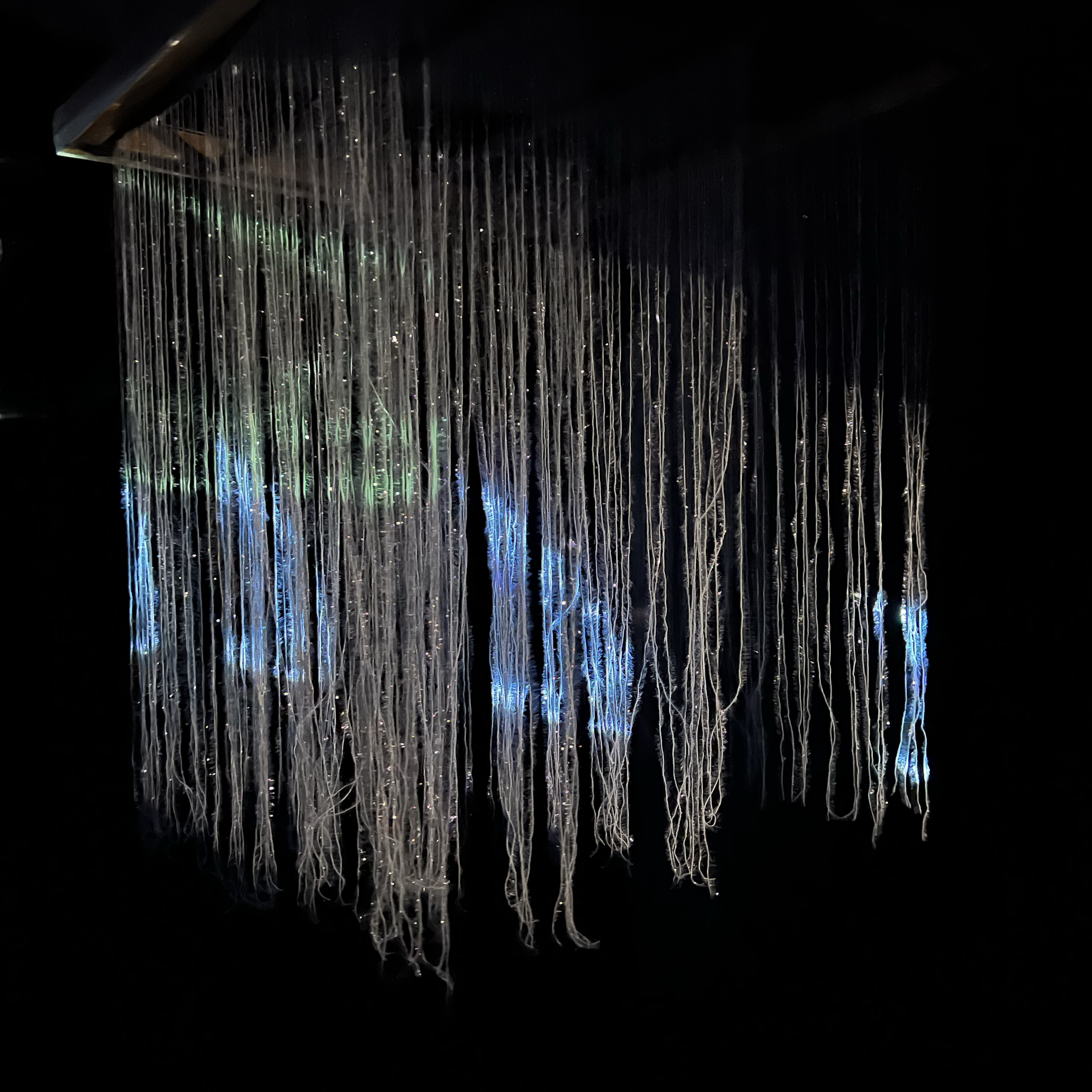 Two early test versions projected, one kinetic (left) and the other (right) onto gallery windows in North Vancouver, August 2025